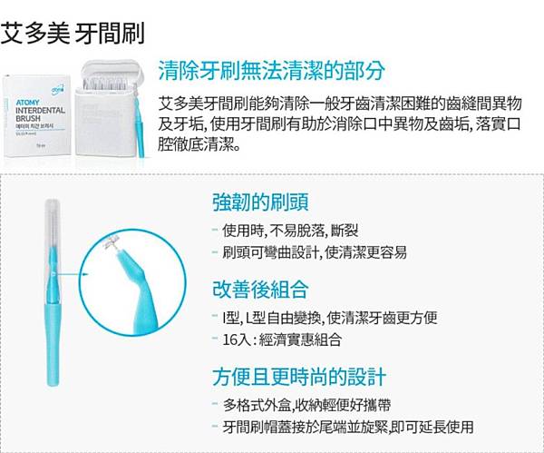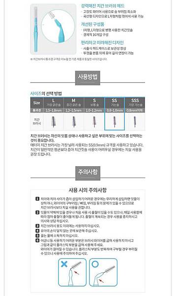 首先要挑選適合的牙間刷。我們可以根據自身牙縫大小,選擇從小到大分別為SSS,SS,S,M,L五種規格的牙刷。如果初次購買不知道如何選擇,可以先從最小號SSS型號的開始,而SS型號的適合大部分人群。(艾多美的牙間刷是SS號,0.9mm的)一搬市售是寬度一樣的刷毛,艾多美刷毛是上窄下寬設計, 刷毛有他基本的清潔功能,也不會過於僵硬,即使你刷到牙齦也不會有疼痛感。